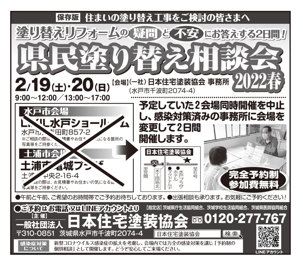 2022年2月19日(土)と20日(日)の2日間は、今年初めての「県民塗り替え相談会」を開催します!