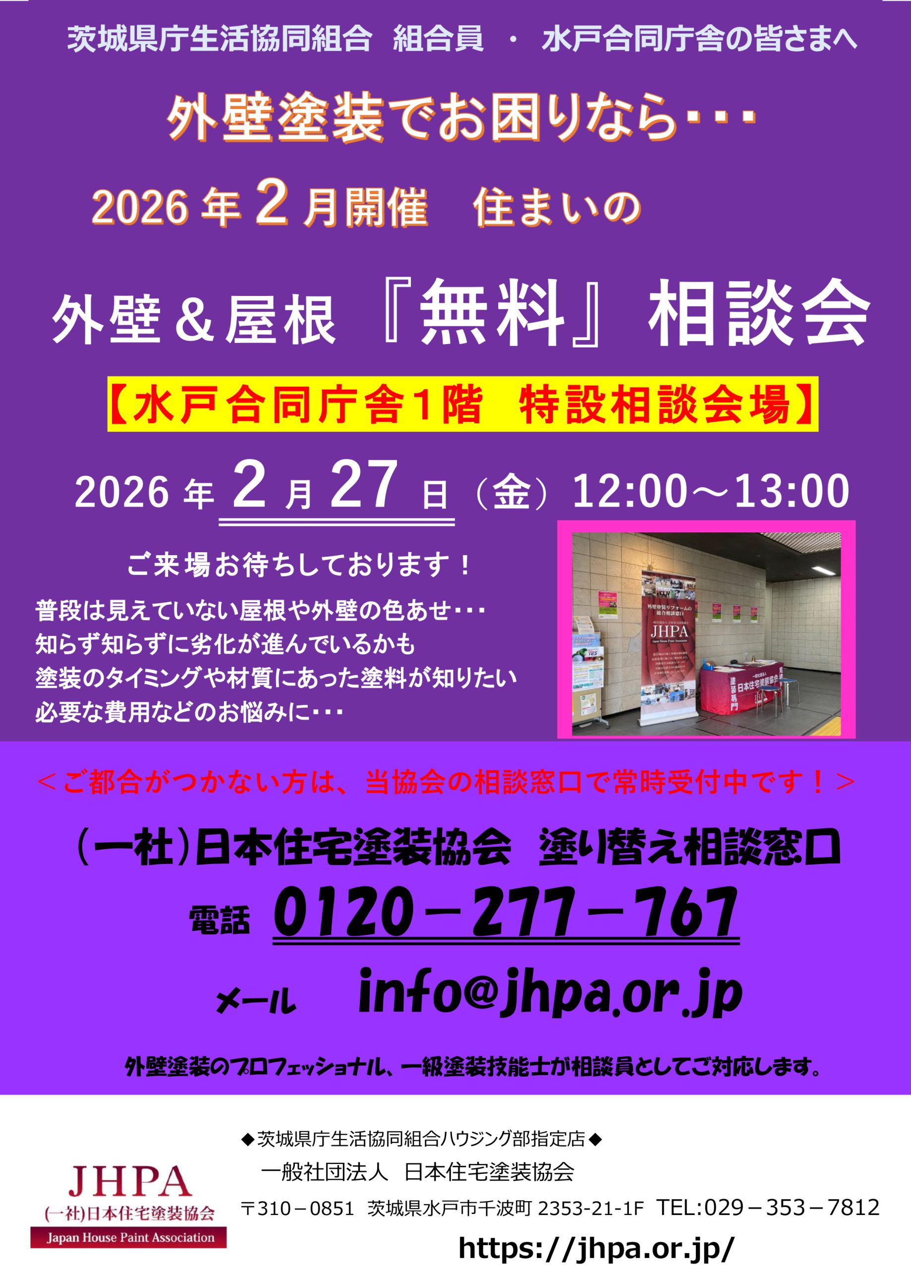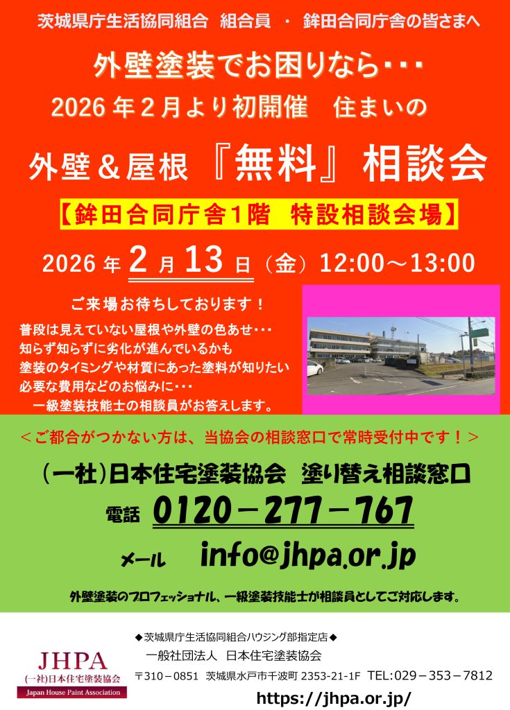 2026年2月開催の塗り替え相談会のお知らせ2026年も2月に入り、まだまだ厳しい寒さが続いていますが。。。 立春を過ぎれば暖かな春も、もうすぐという時期ですね! さて、2026年も「塗り替え 無料 相談... -